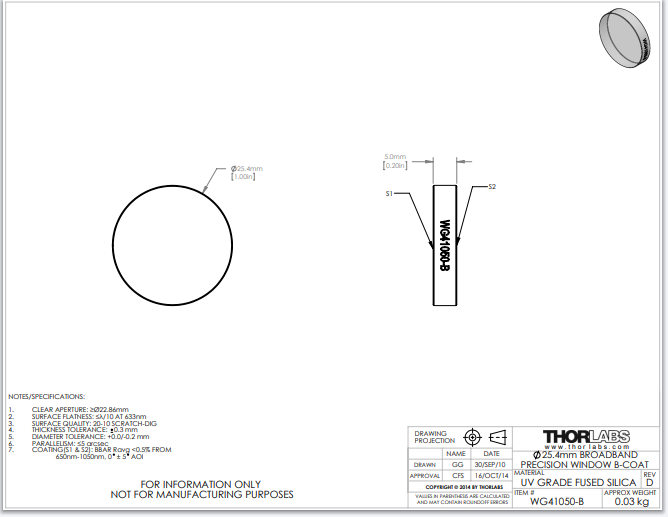 Thorlabs索雷博 WG41050-B - Ø1英寸紫外熔融石英宽带高精度窗口片