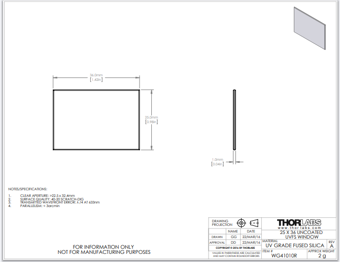 Thorlabs索雷博     WG41010R - 25 mm x 36 mm紫外熔融石英宽带高精度窗口片