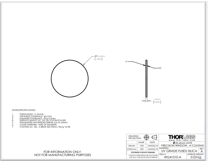 Thorlabs索雷博     WG41010-A - Ø1英寸紫外熔融石英宽带高精度窗口片