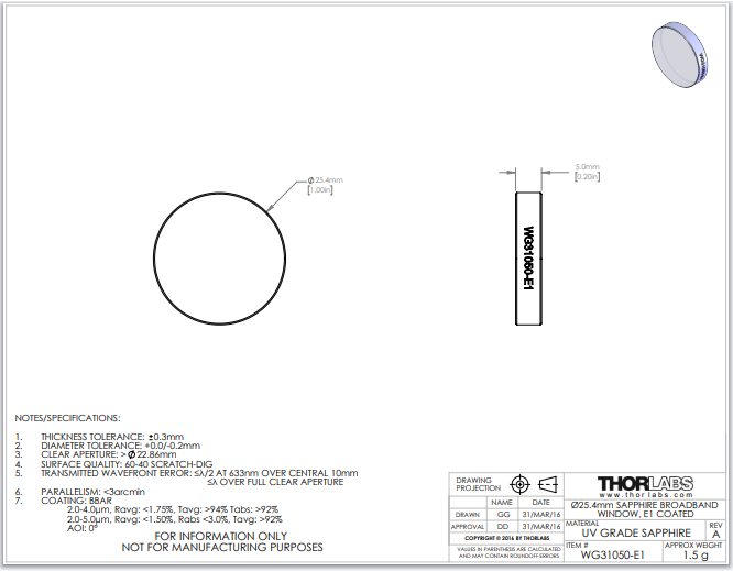 Thorlabs索雷博 WG31050-E1 - Ø1英寸蓝宝石宽带精密窗口片