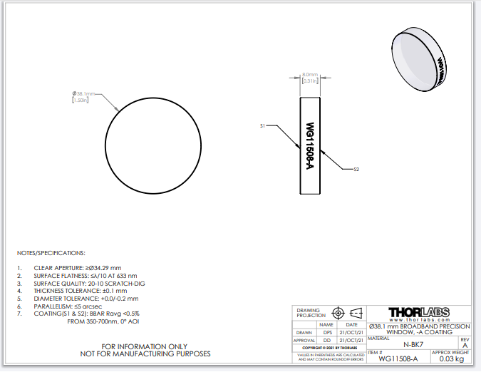 Thorlabs索雷博 WG11508-A - Ø1.5英寸N-BK7宽带精密窗口片