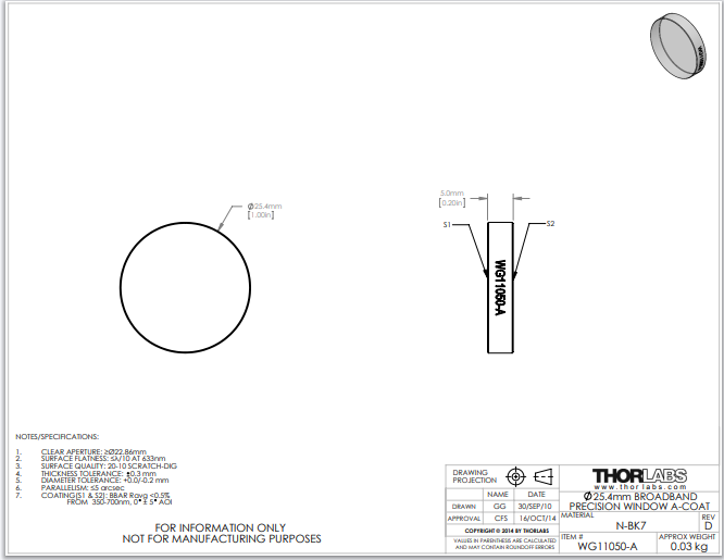 Thorlabs索雷博 WG11050-A - Ø1英寸N-BK7宽带精密窗口片