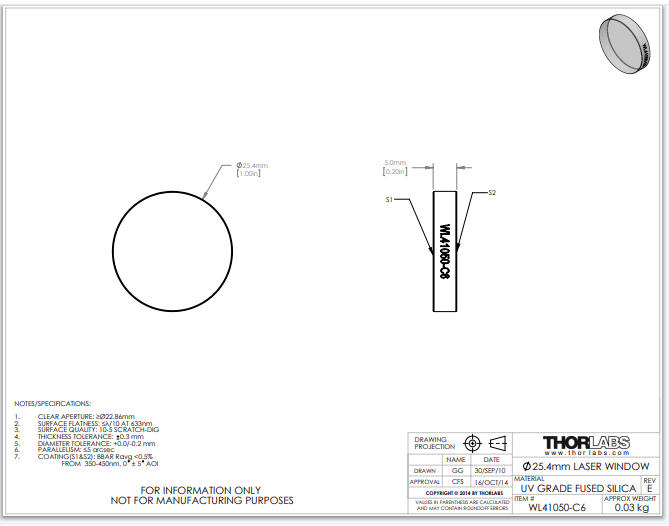 Thorlabs索雷博 WL41050-C6 - Ø1英寸熔融石英激光窗口片
