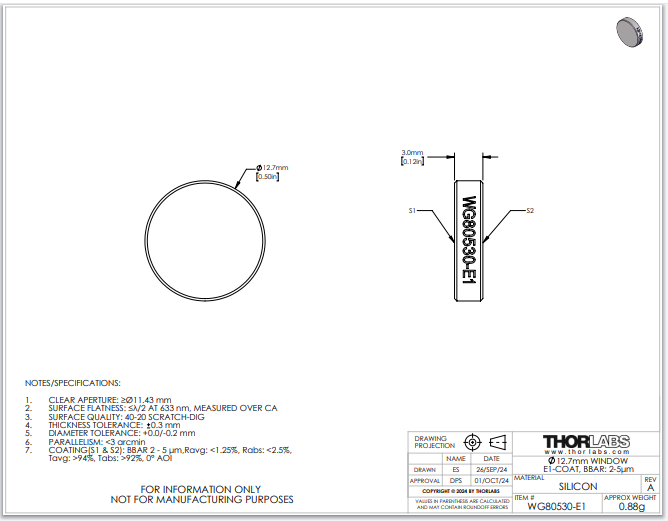 Thorlabs索雷博 WG80530-E1 - Ø1/2英寸硅宽带精密窗口片