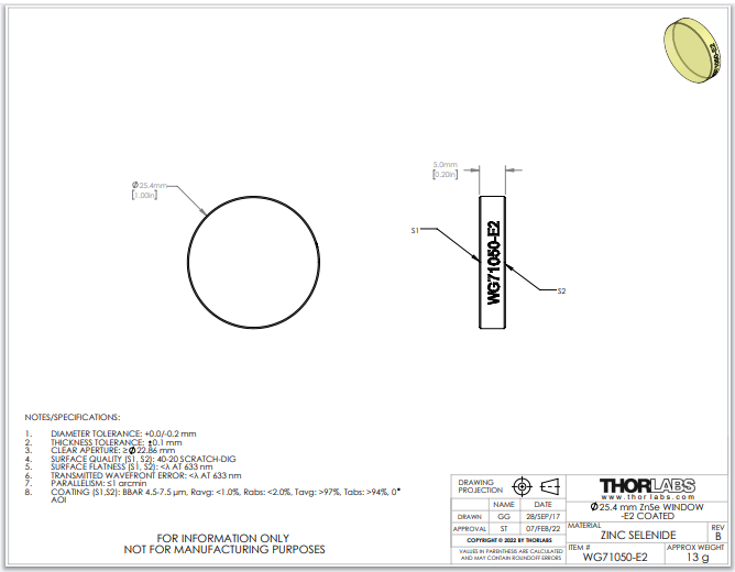 Thorlabs索雷博     WG71050-E2 - 硒化锌宽带精密窗口片