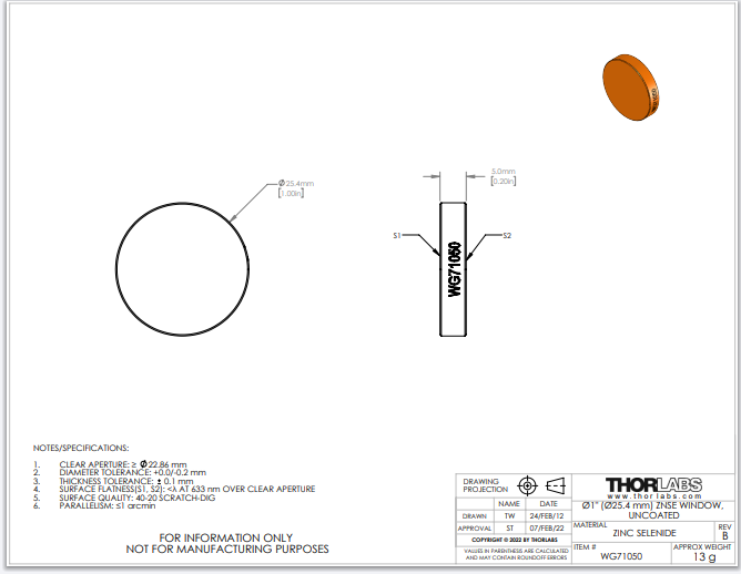 Thorlabs索雷博 WG71050 - 硒化锌宽带精密窗口片
