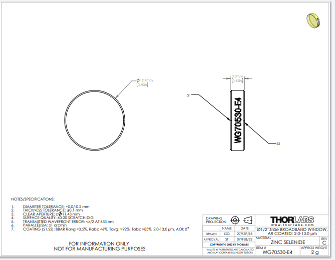 Thorlabs索雷博 WG70530-E4 - 硒化锌宽带精密窗口片