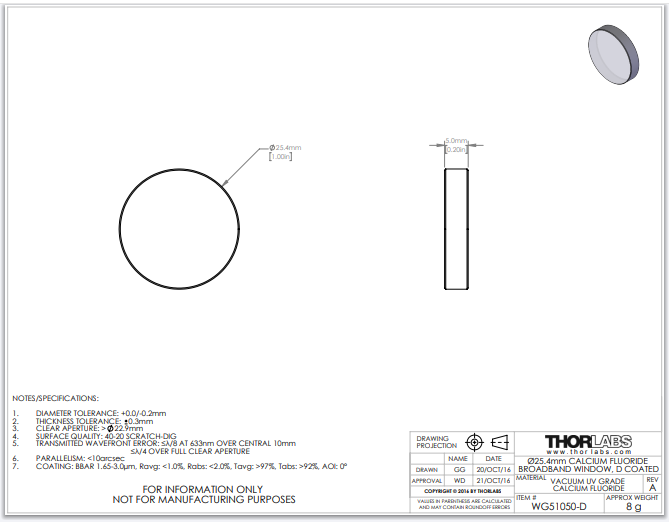 Thorlabs索雷博 WG51050-D - 氟化钙宽带精密窗口片