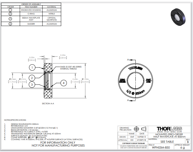 Thorlabs索雷博 WPH05M-850 - 零级半波片