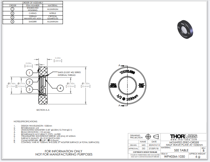 Thorlabs索雷博     WPH05M-1030 - 零级半波片
