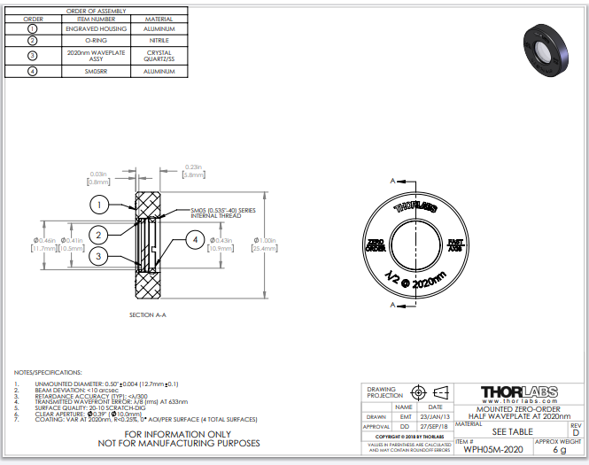 Thorlabs索雷博 WPH05M-2020 - 零级半波片