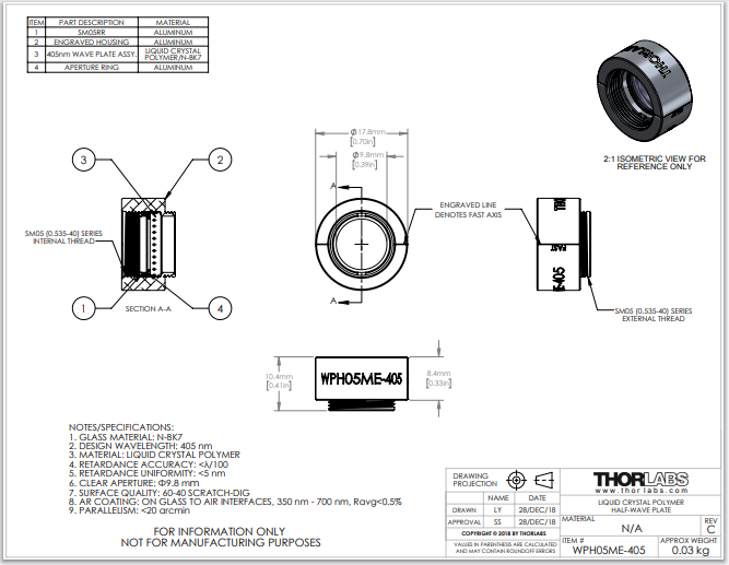 Thorlabs索雷博     WPH05ME-405 - 聚合物零级半波片