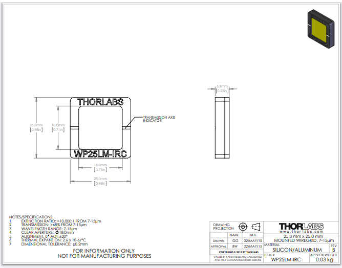 Thorlabs索雷博 WP25LM-IRC - 25.0毫米x25.0毫米已安装座线栅偏振片