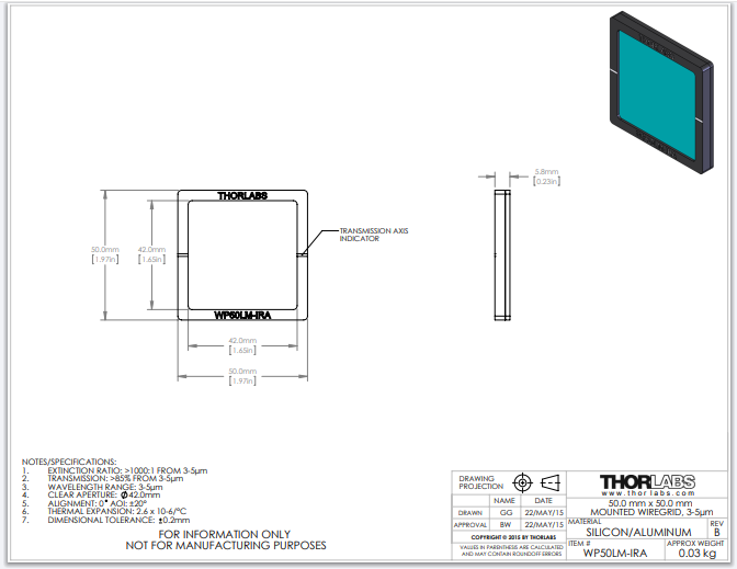 Thorlabs索雷博 WP50LM-IRA - 50.0毫米x50.0毫米已安装座线栅偏振片