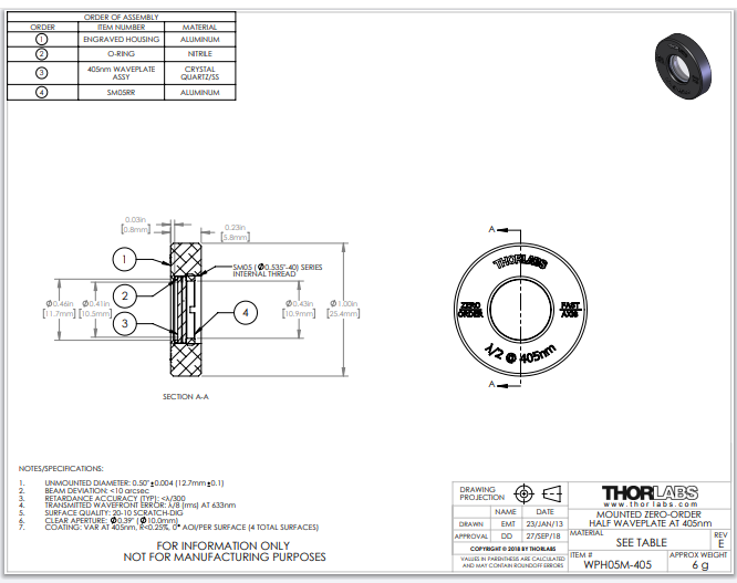Thorlabs索雷博     WPH05M-405 - 零级半波片