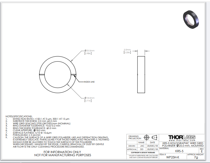 Thorlabs索雷博 WP25H-K - KRS-5全息线栅偏振片