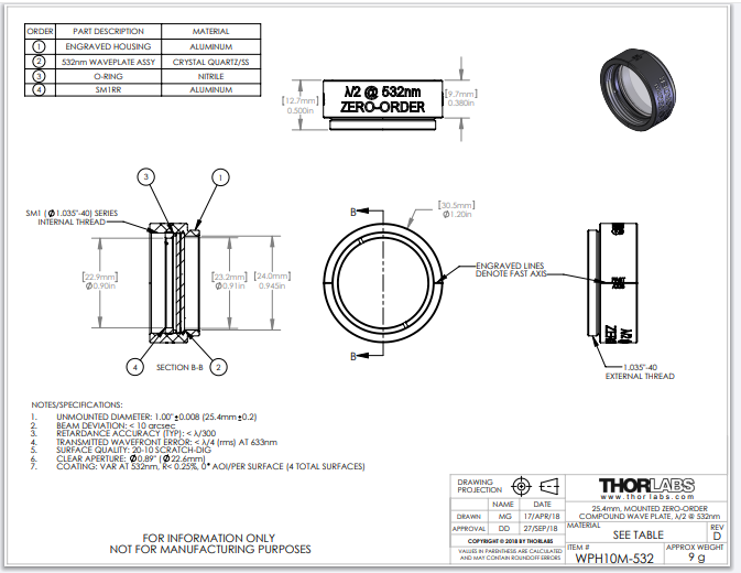 Thorlabs索雷博 WPH10M-532 - 零级半波片