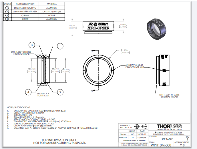 Thorlabs索雷博 WPH10M-308 - 零级半波片