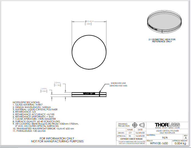 Thorlabs索雷博     WPH10E-1650 - 聚合物零级半波片