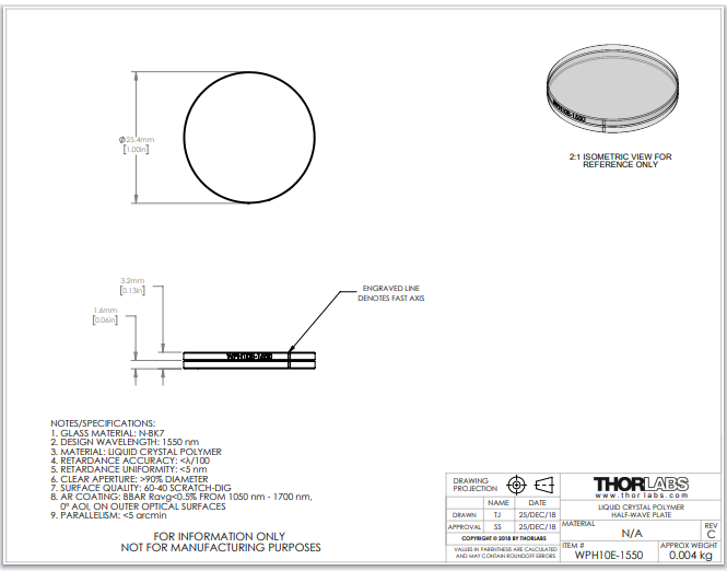 Thorlabs索雷博     WPH10E-1550 - 聚合物零级半波片