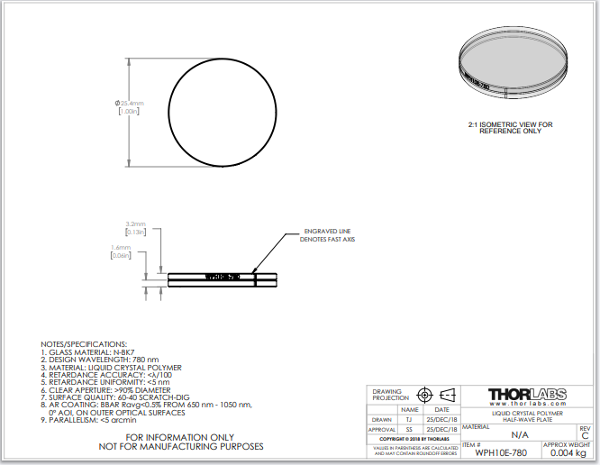 Thorlabs索雷博 WPH10E-780 - 聚合物零级半波片