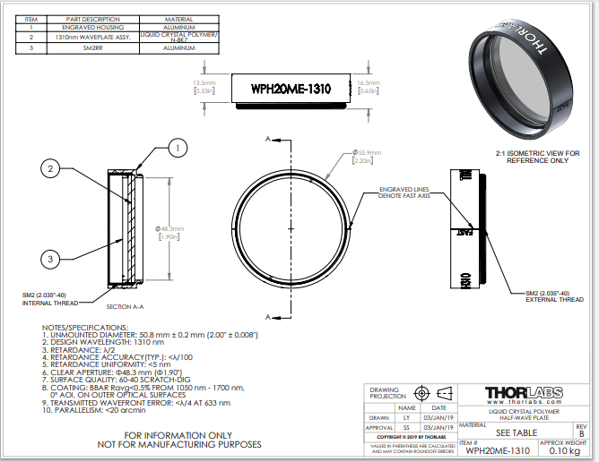 Thorlabs索雷博 WPH20ME-1310 - 聚合物零级半波片