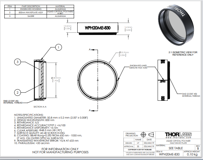 Thorlabs索雷博     WPH20ME-830 - 聚合物零级半波片