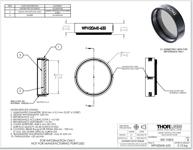 Thorlabs索雷博     WPH20ME-633 - 聚合物零级半波片