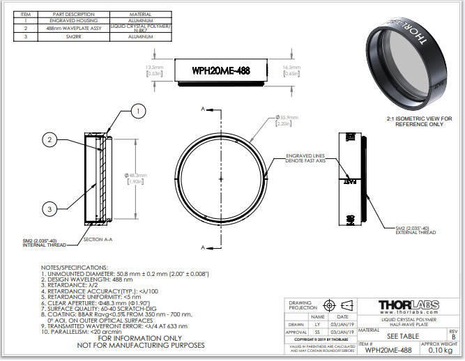 Thorlabs索雷博 WPH20ME-488 - 聚合物零级半波片