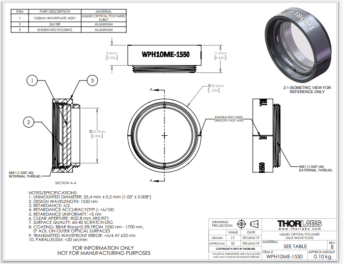 Thorlabs索雷博 WPH10ME-1550 - 聚合物零级半波片