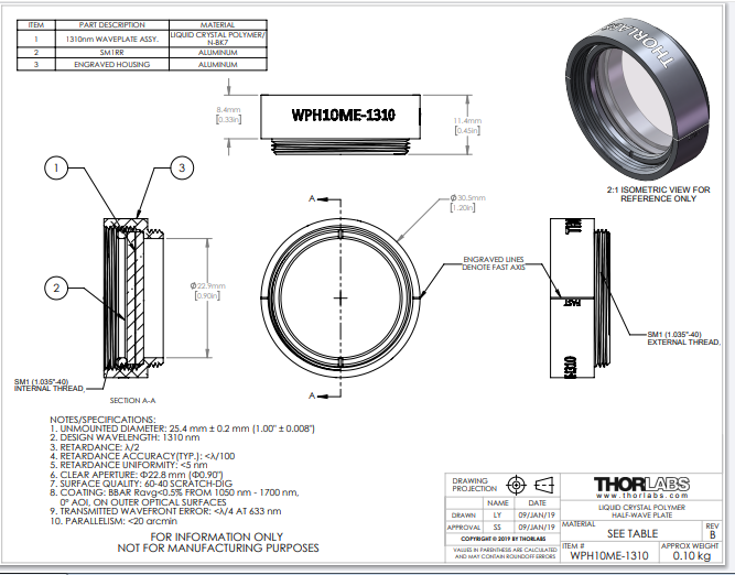 Thorlabs索雷博 WPH10ME-1310 - 聚合物零级半波片