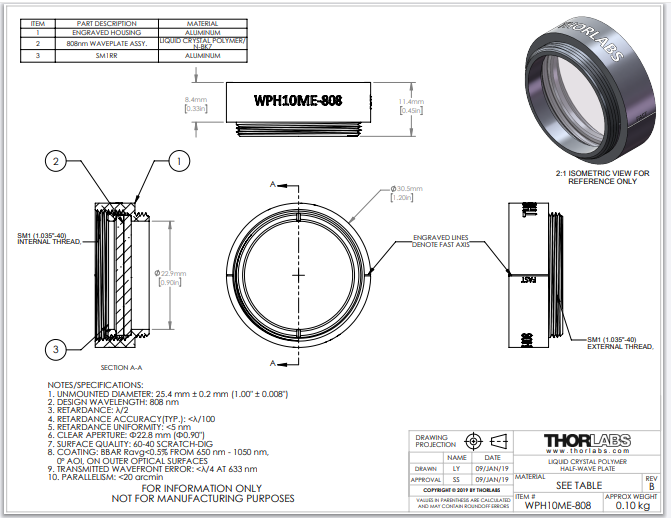 Thorlabs索雷博 WPH10ME-808 - 聚合物零级半波片