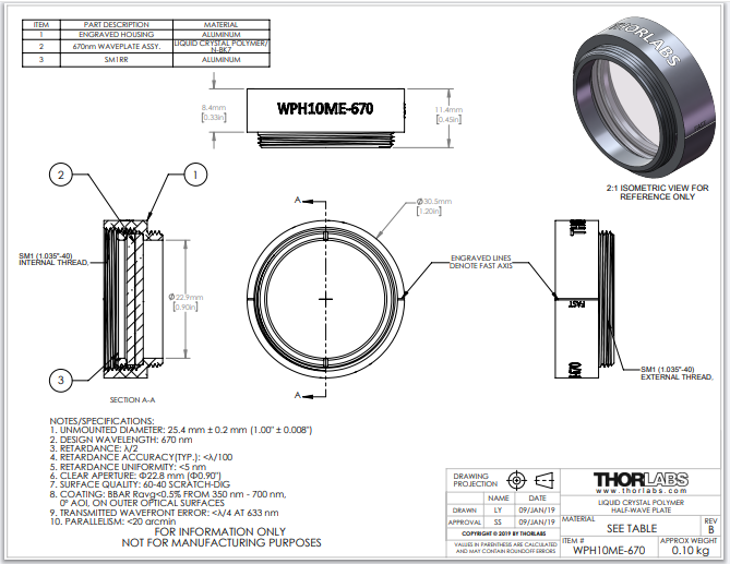 Thorlabs索雷博 WPH10ME-670 - 聚合物零级半波片