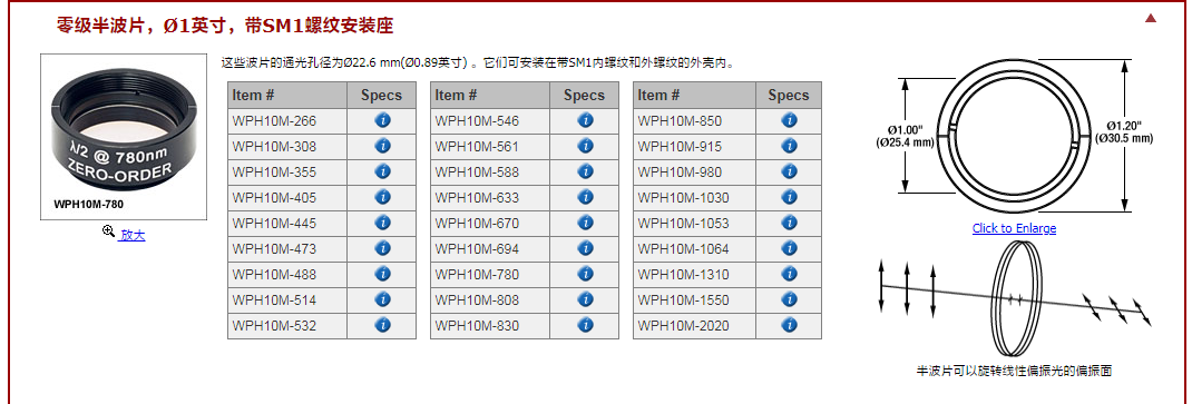 Thorlabs索雷博 WPH10M-1053 - 零级半波片