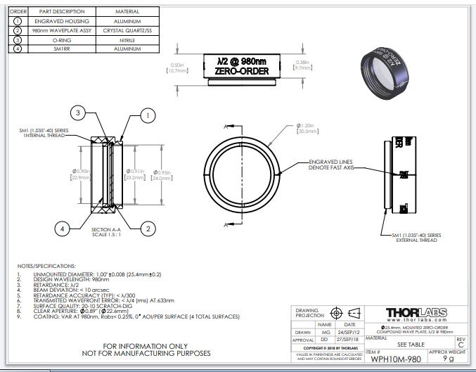 Thorlabs索雷博 WPH10M-980 - 零级半波片