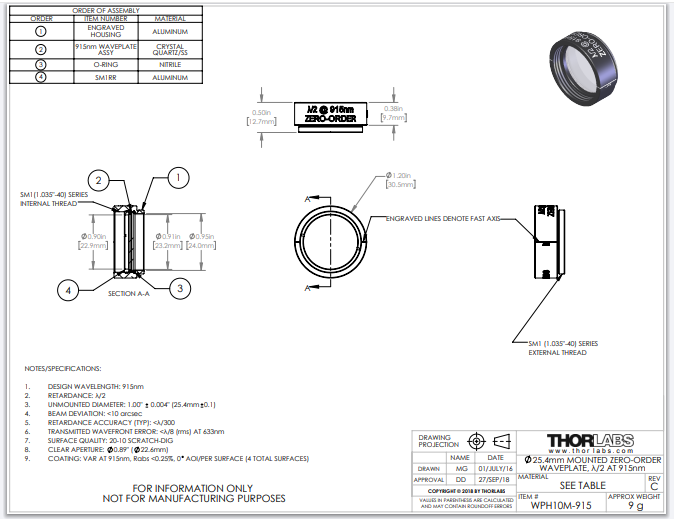 Thorlabs索雷博 WPH10M-915 - 零级半波片