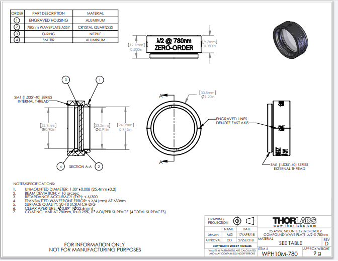 Thorlabs索雷博 WPH10M-780 - 零级半波片