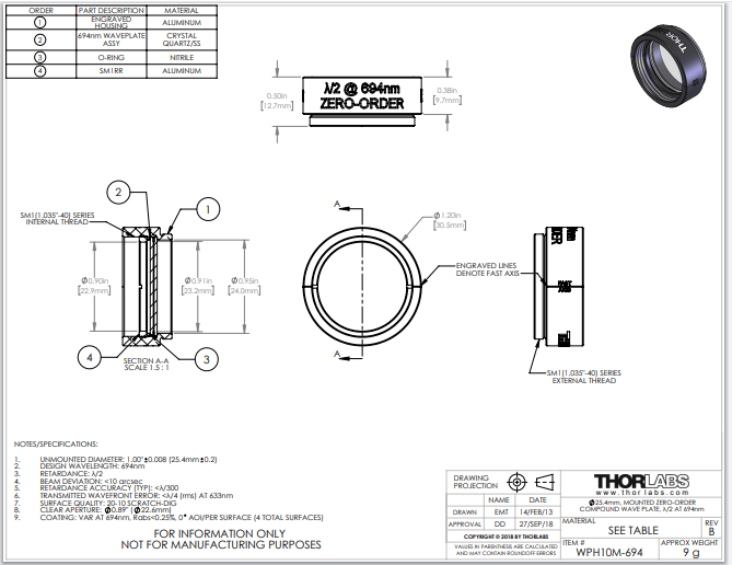 Thorlabs索雷博 WPH10M-694 - 零级半波片
