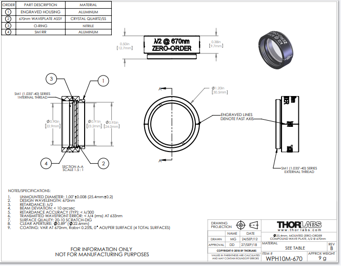 Thorlabs索雷博 WPH10M-670 - 零级半波片