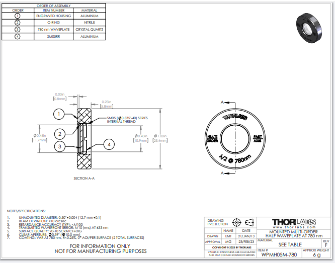 Thorlabs索雷博 WPMH05M-780 - Ø1/2英寸多级半波片