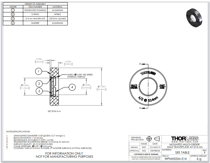 Thorlabs索雷博 WPMH05M-514 - Ø1/2英寸多级半波片