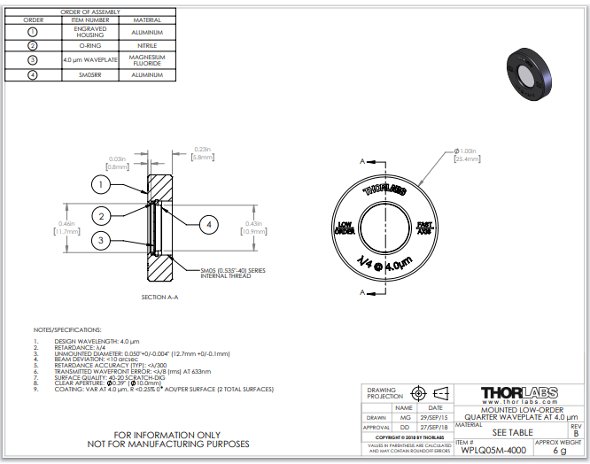 Thorlabs索雷博 WPLQ05M-4000 - 低阶四分之一波片