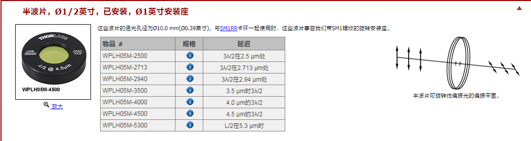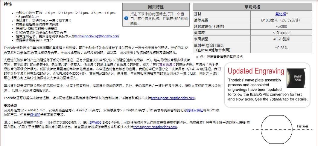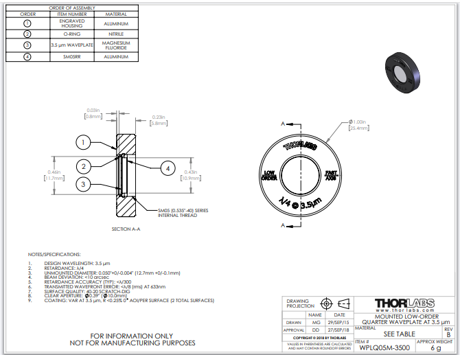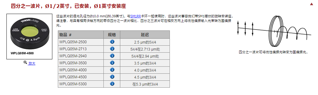 Thorlabs索雷博 WPLQ05M-3500 - 低阶四分之一波片