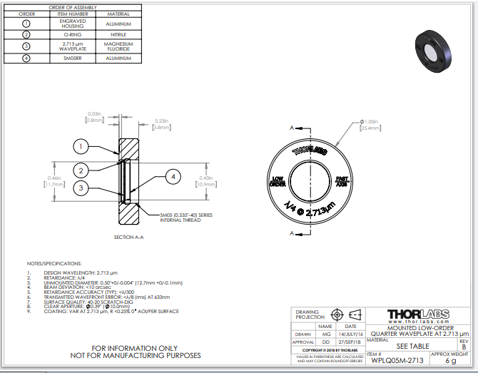 Thorlabs索雷博 WPLQ05M-2713 - 低阶四分之一波片