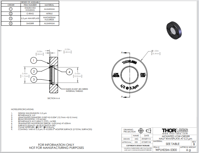 Thorlabs索雷博 WPLH05M-5300 - 真零级半波片
