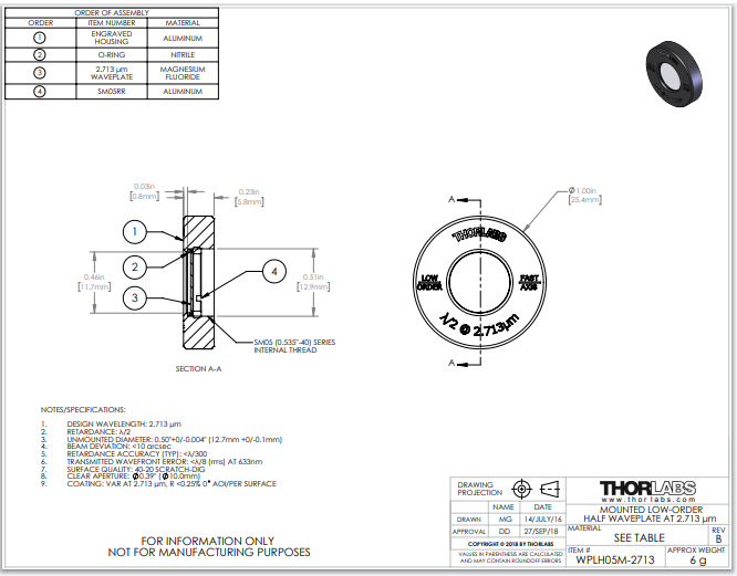 Thorlabs索雷博 WPLH05M-2713 - 低阶半波片
