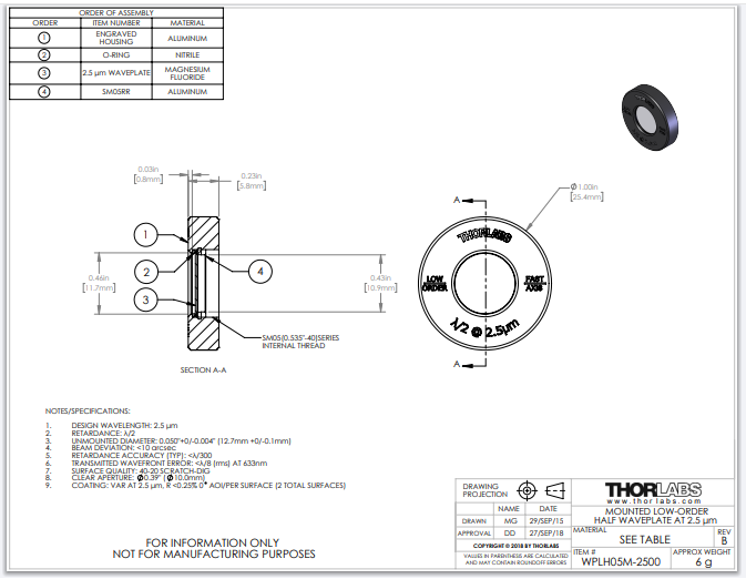 Thorlabs索雷博 WPLH05M-2500 - 低阶半波片