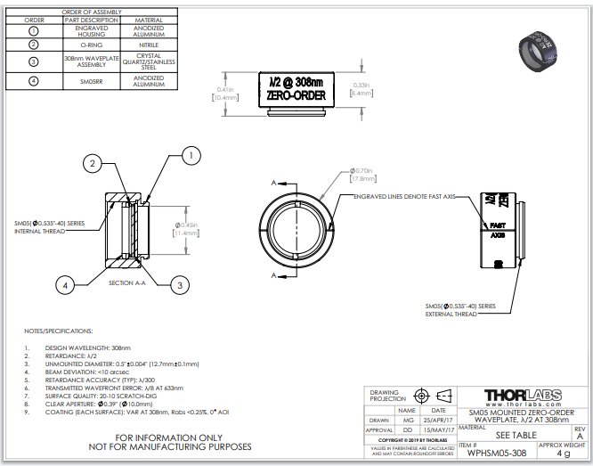 Thorlabs索雷博 WPHSM05-308 - 零级半波片