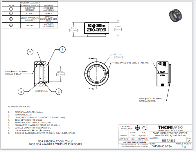 Thorlabs索雷博 WPHSM05-266 - 零级半波片