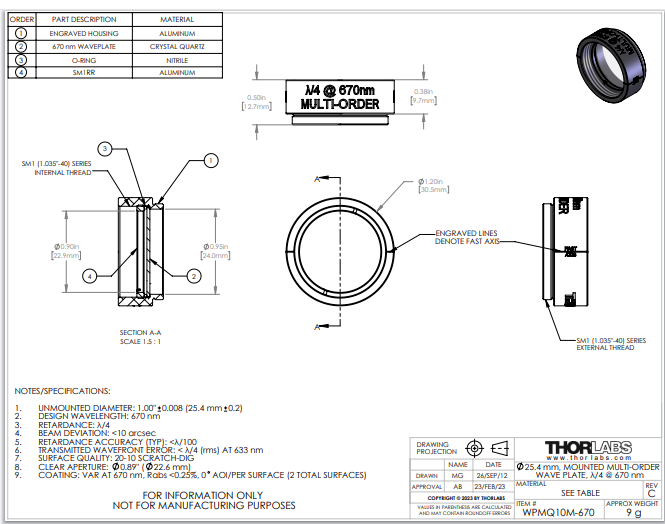 Thorlabs索雷博 WPMQ10M-670 - Ø1英寸多级四分之一波片